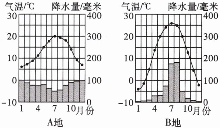 1. 据图可知,A、B两地最热月平均气温都出现在7月,因此都位于