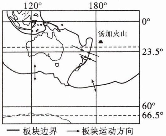 2022年1月,汤加某岛火山剧烈喷发。如图为该火山位置示意图。读图,完成(1)~(2)题。