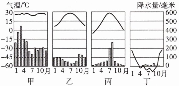 读下面四地气温年变化曲线与年降水量柱状图,完成(1)~(2)题。