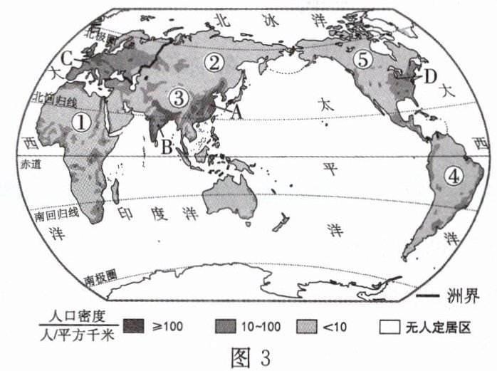 3. 由图3可知,世界人口稠密区主要集中在A______