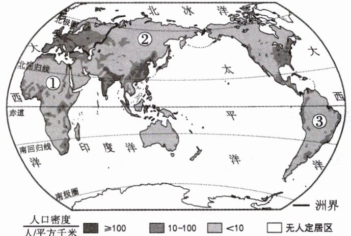 受自然环境和社会经济等因素的影响,世界人口分布很不均衡。读世界人口分布图,完成3~4题。