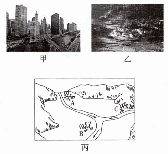 。3. 图丙中A、B、C三处聚落选址的共同点是