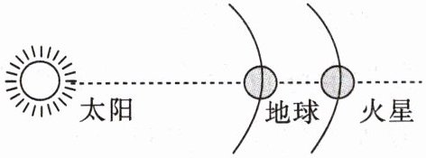 2020 年 7 月 23 日,我国首次火星探测任务“天问一号”火星探测器在海南文昌航天基地发射成功,并于 2021 年 5 月 15 日成功着陆火星,开启了我国探测火星的新征程。读地球、火星、太阳的位置示意图(非真实比例),完成 4~5 题。