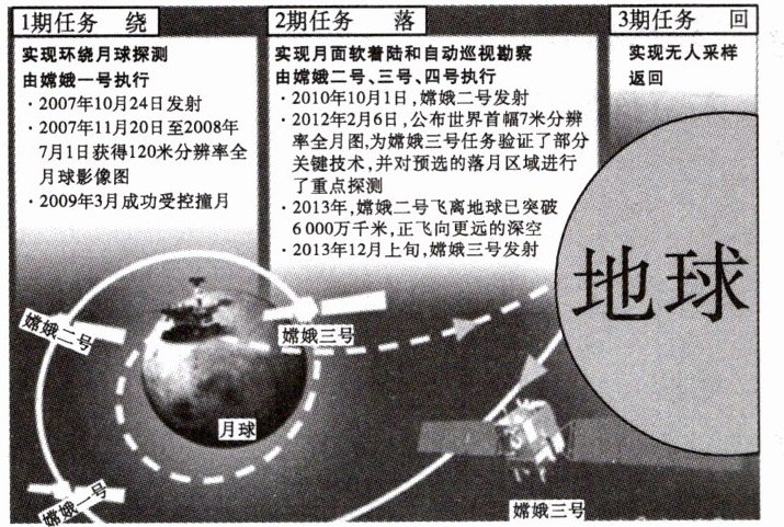 2. 读“探月工程三部曲示意图”,各嫦娥探测器中,已完成任务并离开月球和地球的束缚,继续远航探测的是(