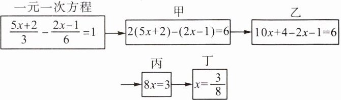 3. 小组活动中,同学们采用接力的方式求一元一次方程的解,规则如下:每人只能看到前一人计算的结果,并进行一步计算,再将结果传递给下一人,最后求出方程的解. 过程如下: