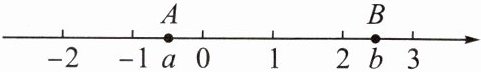 9. 如图,点 A,B 在数轴上表示的数分别是 a,b,有下列说法:①$ a < -1 $,$ b > 3 $;②点 A,B 之间的非负整数是 1,2;③$ |a| - |b| = -a - b $;④$ -b < a < |a| < b $。其中正确的有______。(填序号)