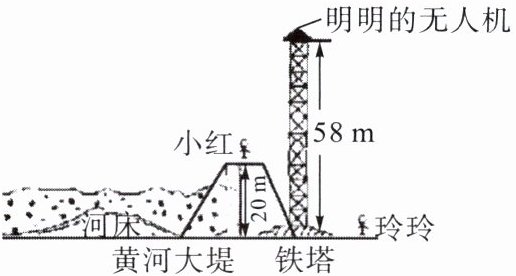 12. 小红和好朋友明明、玲玲出去玩,小红站在黄河大堤上,玲玲站在地面放风筝,明明则遥控无人机飞到铁塔顶上(如图)。小红说:“以大堤为基准,记为$0\ {m}$,则玲玲所在的位置高为$-20\ {m}$,明明的无人机所在的位置高为$+58\ {m}$”。明明说:“以铁塔顶为基准,记为$0\ {m}$,则玲玲所在的位置高为$-58\ {m}$,小红所在的位置高为$-38\ {m}$”。玲玲说:“明明的无人机所在的位置比我高$58\ {m}$”。他们谁说得对?