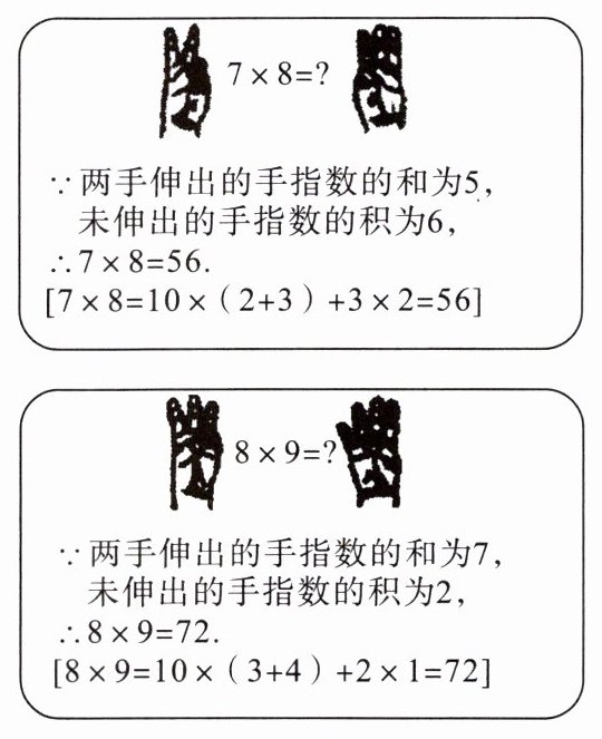 12. 如图所示为使用法国“小九九”计算$7×8和8×9$的两个示例. 若用法国的“小九九”计算$7×9$,左、右手依次伸出手指的个数是( )