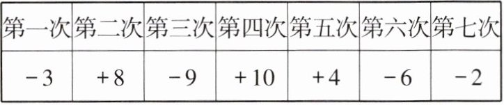 某检修小组开车从 $A$ 地出发,在东西方向的马路上检修线路. 如果规定向东行驶为正,向西行驶为负,一天中七次行驶记录如下表(单位:$km$)。