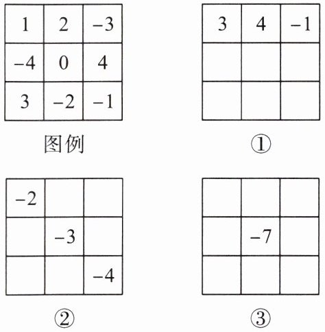 13. 如图的图例是一个方阵图,每行的 3 个数、每列的 3 个数、斜对角的 3 个数相加的和均相等。如果将方阵图的每个数都加上同一个数,那么方阵中每行的 3 个数、每列的 3 个数、斜对角的 3 个数相加的和仍然相等,这样就形成新的方阵图。根据图①②③中给出的数,对照原来的方阵图,请你完成图①②③的方阵图。