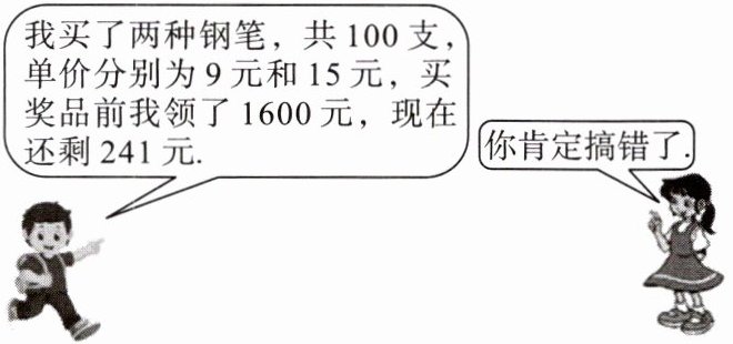 (1)设单价为 9 元的钢笔买了 $ x $ 支,单价为 15 元的钢笔买了 $ (100 - x) $ 支. 请用方程的知识帮助宣传委员计算一下,为什么说宣传委员搞错了.