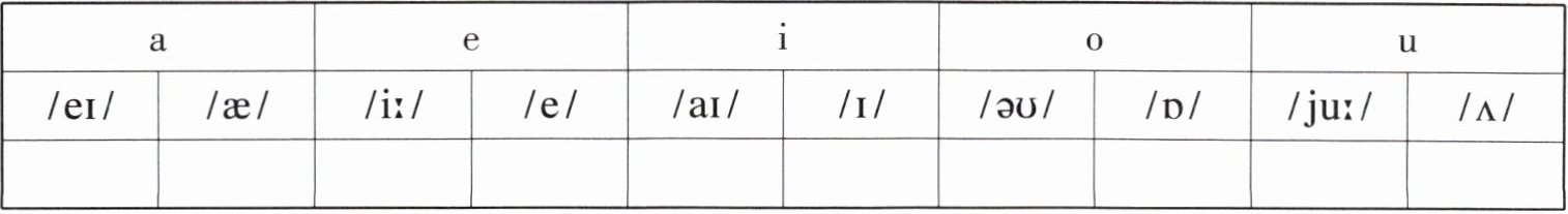 | /eɪ/ | /æ/ | /i:/ | /e/ | /aɪ/ | /ɪ/ | /əʊ/ | /ɒ/ | /ju:/ | /ʌ/ |