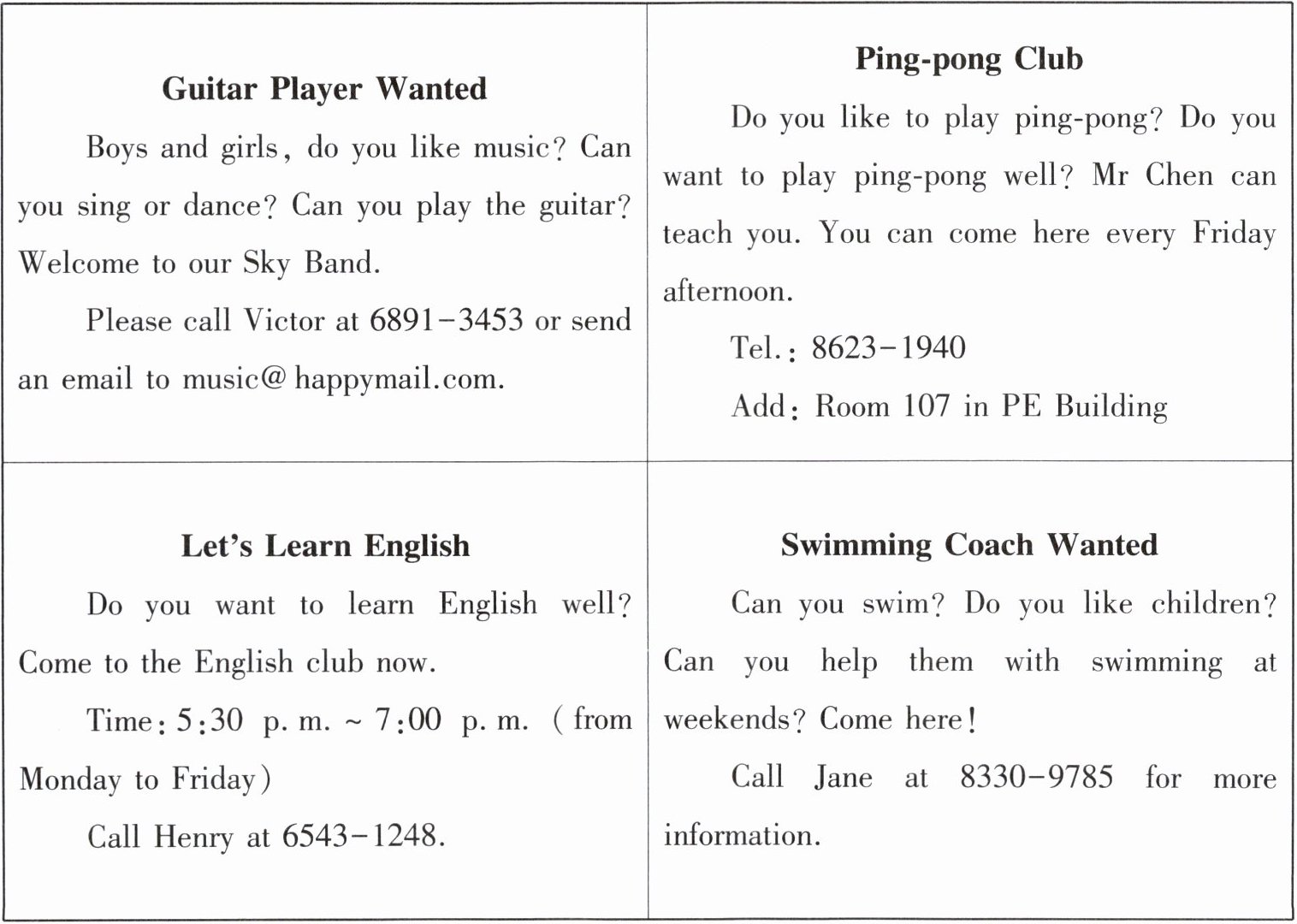 | Do you want to learn English well? Come to the English club now. | Can you swim? Do you like children? Can you help them with swimming at weekends? Come here! |