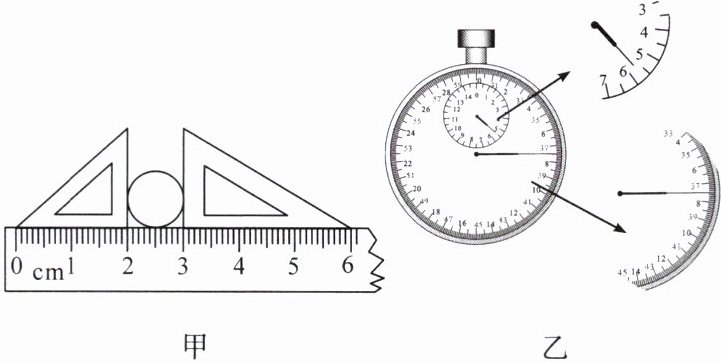 (1)如图甲所示,小明用刻度尺和三角板测得圆形物体的直径为______ $cm$;如图乙所示,秒表的读数为______ $s$。