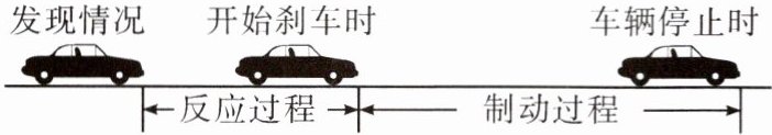例3 汽车遇到意外情况时紧急停车要经历反应和制动两个过程,汽车在反应过程中做匀速直线运动,在制动过程中做变速直线运动,如图所示。若汽车以 $20m/s$的速度在平直的公路上行驶,紧急停车时,在反应过程中,汽车行驶了 $14m$,在制动过程中所用的时间为 $2.3s$,汽车在两个过程中通过的总距离为 $30m$,求: