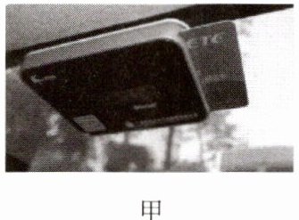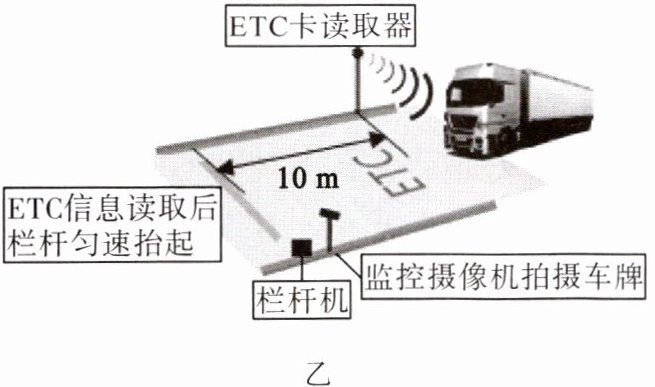 为了提高高速公路的通行效率,高速收费站建有 ETC 专用通道。ETC 专用通道需要汽车安装 ETC 卡(如图甲),图乙所示是 ETC 专用通道示意图。当汽车进入 ETC 卡读取器识别范围的时候,卡上的信息被读取,同时栏杆机将横杆抬起,汽车无须停车就实现了缴费,大大节约了通站时间。