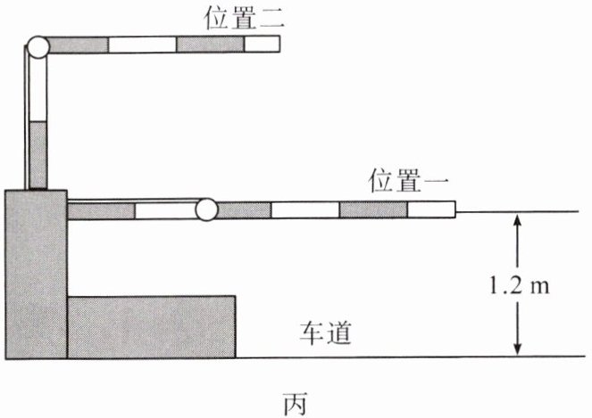 (3)某一 ETC 通道,栏杆机距 ETC 卡读取器 10 m,横杆在位置一(如图丙)时距地面的高度为 1.2 m,栏杆机启动后横杆水平段沿竖直方向以 0.2 m/s 的速度匀速抬起。某人驾驶一辆车高为 1.6 m 的汽车通过该 ETC 通道,汽车距离 ETC 卡读取器 5 m 时被读取信息。假设栏杆机横杆水平段同时抬起,以该汽车的高度,当车速太快,横杆抬起高度不够时,会撞杆违章。根据题中所给的条件,该汽车匀速顺利通过通道的最快速度是
