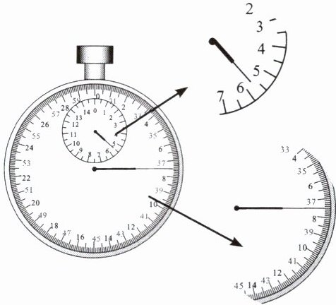 在秒表的中间表盘上,1 min中间有两个小格,所以一个小格代表0.5 min,指针在“5”和“6”之间,偏向“6”一侧,所以分针指示的时间为5 min;在秒表的大表盘上,1 s之间有5个小格,一个小格代表0.2 s,指针在37.5处,秒针指示的时间为37.5 s。