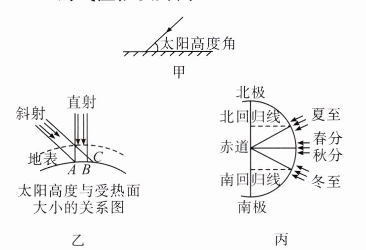 按天文类是如何划分的呢?在地球绕太阳公转的过程中,太阳光在地球上某地的入射方向和地平面之间的夹角在不断变化,如图甲所示,这个夹角叫太阳高度角,也叫太阳高度。如图乙所示,太阳高度越大,光束越集中,单位面积的地表上太阳辐射的强度就越大,当太阳直射时,太阳高度角为 $ 90^{\circ} $,辐射强度最大。如图丙所示,太阳直射点由南向北达到赤道和北回归线时,分别是春分和夏至:由北向南达到赤道和南回归线时,分别是秋分和冬至,立春、立夏、立秋、立冬也是按天文类划分的,表示每个季节的开始。