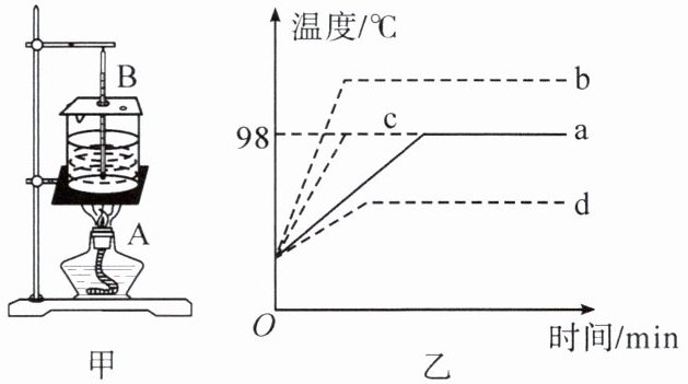 (3)小明根据实验数据绘制的水沸腾前后温度随时间变化的图像如图乙中的 $ a $ 所示,如果同组的小红减少烧杯中水的质量,水沸腾前后温度随时间变化的图像可能是图乙中的______(选填“b”“c”或“d”)。