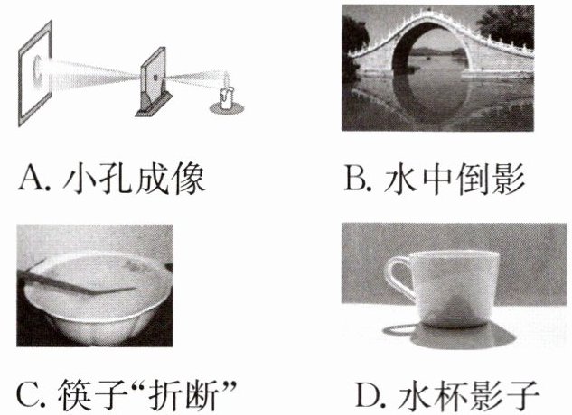思路点拨 A. 小孔成像是光沿直线传播形成的;B. 水中倒影是平面镜成像,是光的反射形成的;C. 筷子“折断”是光从水中斜射入空气中时,在水面处发生折射形成的;D. 水杯影子是光沿直线传播形成的。
