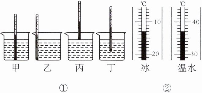 13. 使用温度计时,首先要观察它的量程和认清它的______。小强在用温度计测量烧杯中液体的温度时读取了四次数据,每次读数时温度计的位置如图①所示,其中正确的是______。如图②所示是用温度计分别测得的冰和温水的温度,那么冰的温度是______ $ ^{\circ}C $,温水的温度是______ $ ^{\circ}C $。