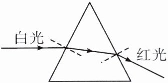 如图所示,一束白光透过三棱镜发生色散现象,图中已画出红光的折射情况,请参考红光的光路,画出紫光的光路图(要求画出折射光线和法线)。