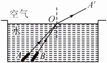 (2024·河南)如图,观光水池中,一束红光沿AO方向从水中射入空气,折射光线为OA'。若另一束红光沿BO方向从水中射入空气,请大致画出入射光线BO的折射光线,并标出对应的折射角r。