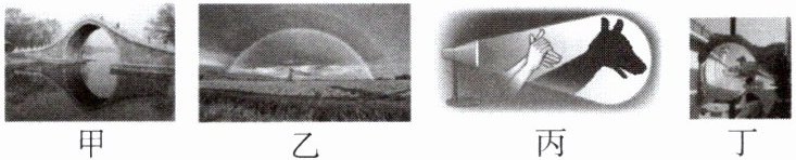 思路点拨 A. 图甲中,桥在水中的倒影,属于平面镜成像,是由于光的反射形成的;B. 图乙中,太阳光射入雨后空气中的小水滴时,太阳光经过折射发生色散,从而形成彩虹;C. 图丙中,影子的形成说明光是沿直线传播的;D. 图丁中,景物在凸面镜中成像扩大视野,是凸面镜成像,属于光的反射现象。