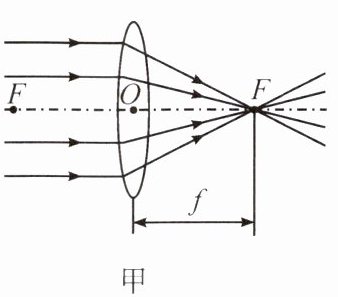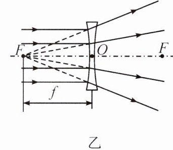 的距离。焦距用 $ f $ 表示(如图甲、乙所示)。焦距的大小表示透镜的会聚或发散