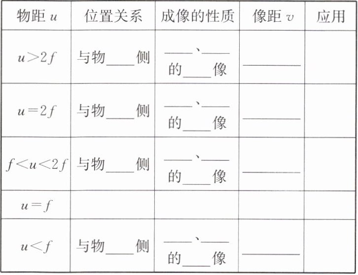 异;倒立;缩小;实;$f<v<2f$;照相机;异;倒立;等大;实;$v=2f$;测焦距;异;倒立;放大;实;$v>2f$;投影仪;不成像;同;正立;放大;虚;$v>u$;放大镜