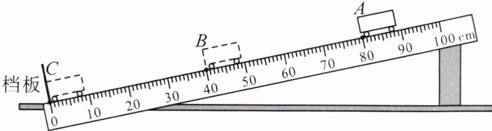 例 如图所示,在斜面上测量小车运动的平均速度,让小车从斜面的 A 点由静止开始下滑,分别测出小车到达 B 点和 C 点的时间,即可测出不同阶段的平均速度。