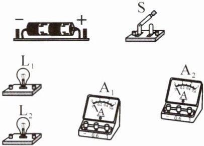 例 2 (2024·贵州期末)请在图中用笔画线代替导线连接实物电路。要求:两灯并联,开关 $ S $ 同时控制两个灯泡,电流表 $ A_1 $ 测量灯泡 $ L_1 $ 的电流,电流表 $ A_2 $ 测量干路电流。