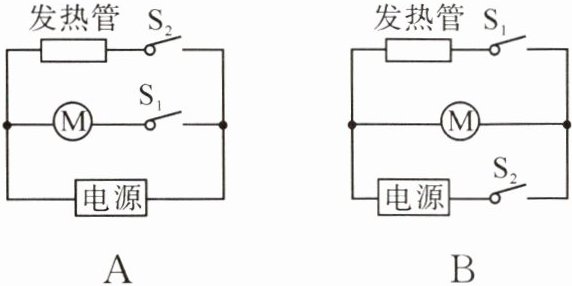 变式训练 1 (2024·内蒙古)某同学想利用发热管、电动机、开关 $ S_1 $ 和 $ S_2 $、电源和导线若干,设计一个电路来实现:同时闭合 $ S_1 $ 和 $ S_2 $ 产生热风;仅闭合 $ S_1 $ 产生冷风;仅闭合 $ S_2 $ 不发热也不吹风。下列电路图符合要求的是( )