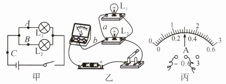 (2)实验时需要测量 $ A $、$ B $、$ C $ 三处的电流。图乙是他们某次测量时连接的实物电路,此时电流表测量的是 ______(选“$ A $”“$ B $”或“$ C $”)处的电流。
