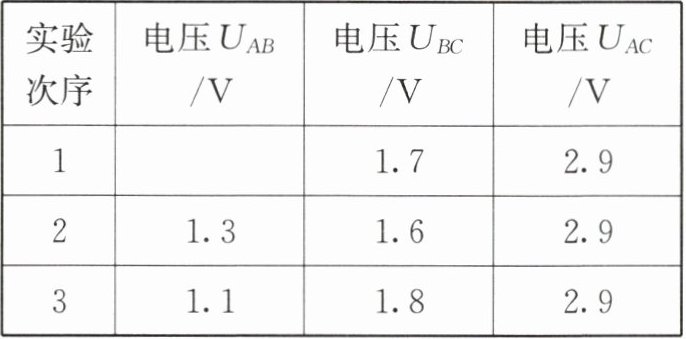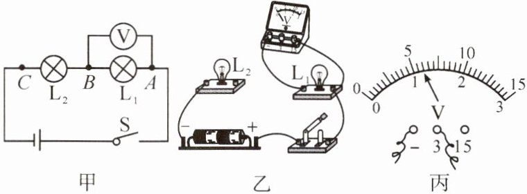 (3)用电压表分别测出电压U_AB、U_BC和U_AC。其中测U_AB时,电压表的示数如图丙所示,示数为_________V。接着更换不同规格的灯泡并多次实验,数据记录如表。