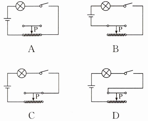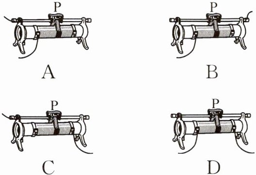 如图所示,给出了滑动变阻器四种接入电路的结构示意图。其中,当滑片 P 向左滑动时,使连入电路中的电阻变大的接法是( )