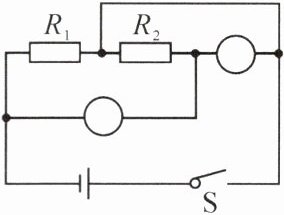 思路点拨 开关S闭合时,两电阻均消耗电能,则$R_1、$$R_2$均能工作;若右边圆圈内填入电流表,则左下方圆圈内只能填电压表,以防止电源被短路,但此时导线将$R_2$和电流表短路,所以右边圆圈内填入电压表,左下方圆圈内只能填电流表$,R_1$和$R_2$并联接入电路。