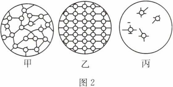 (4)如图2所示是同种物质的三种不同状态下的分子的分布特点,图丙是物质处于______(选填“固态”“液态”或“气态”)下的分子分布特点。物质从图甲所示状态变化到图丙所示状态时,分子间作用力______(选填“变大”“变小”或“不变”)。