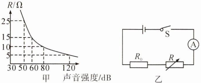 (2024·遂宁)为了监测噪声的强弱,同学们找来定值电阻 $ R_0 $、声敏电阻 $ R $(阻值会随声音强弱发生变化)、电流表、学生电源等器材,设计了可用电流表的示数来反映噪声强弱的装置,其中 $ R $ 的阻值随声音强弱变化的关系如图甲所示,该装置的电路图如图乙所示。在某次测试中,当噪声强度为 $ 80 dB $ 时,电流表示数为 $ 0.4 A $;当噪声强度为 $ 50 dB $ 时,电流表示数为 $ 0.2 A $。下列说法正确的是( )