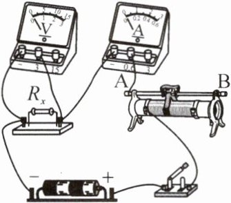 在“用电流表、电压表测电阻”的实验中,某同学连接的实物电路如图所示。闭合开关前为了保护电路,应将滑动变阻器滑片移至______(选填“A”或“B”)端,各电表所测的值均不得超过它们的______,实验中通过改变滑动变阻器的电阻来改变待测电阻$R_x$两端的______,该实验中多次测量的目的是______,最后求出电阻$R_x$的大小。