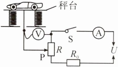 变式训练1 (2024·广州)如图是地磅工作原理示意图,秤台连在竖直弹簧上,电路与恒压电源连接。未称量时,滑动变阻器$R的滑片P$在最上端,称量时,将滑片$P$向下滑动。闭合开关$S$,车辆总质量越大时,( )