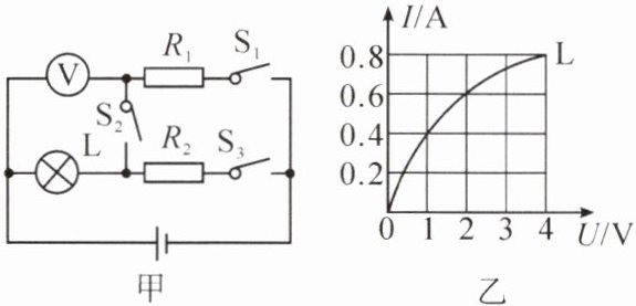 (1)由图可知,当只闭合$S_{1}$、$S_{2}$时,$R_{1}$、L串联,电压表测量灯泡L两端的电压;由图乙可知,当小灯泡两端的电压为2V时,通过小灯泡的电流为0.6A;