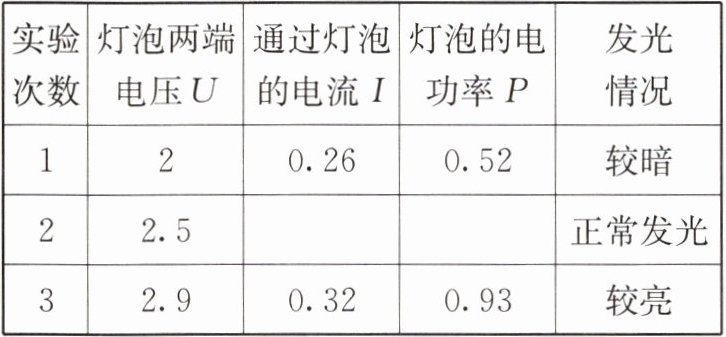 (4)继续移动滑动变阻器的滑片,使小灯泡两端电压为 2.9 V,读出电流表示数,将数据记入表格。如表所示,小江设计的表格的不足之处是______。