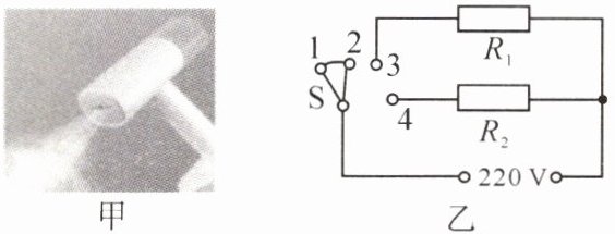 (2023·娄底)如图甲是一款采用增压技术的挂烫机,其简化电路图如图乙,电源电压为 $ 220\ V $,$ R_{1} $、$ R_{2} $ 是电热丝,$ R_{1} = 55\ \Omega $,$ R_{2} = 110\ \Omega $。开关 $ S $ 接 $ 2 $、$ 3 $ 时处于慢热挡,接 $ 3 $、$ 4 $ 时处于速热挡。求: