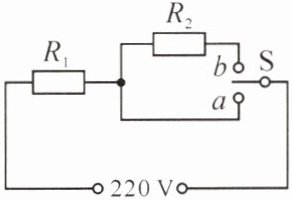 (2024·苏州)某电饭锅的电路图如图所示,发热盘内有发热电阻 $ R_{1} $ 和分压电阻 $ R_{2} $,$ S $ 是温控开关。当 $ S $ 接 $ a $ 时,电饭锅处于高温挡,通过的电流为 $ 4A $;当温度达到一定值时,开关 $ S $ 自动切换到 $ b $,电饭锅处于保温挡,通过的电流为 $ 0.25A $。求:
