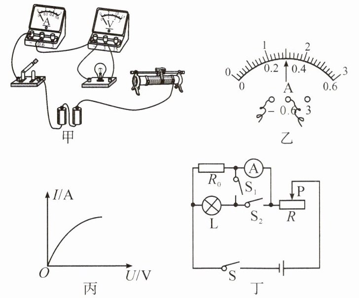 (5)小红还想测出另一个额定电压为 $ U_{额} $ 的小灯泡正常发光时的电阻,在保证电路安全的前提下,设计了如图丁所示的电路(电源电压大于 $ U_{额} $、恒定且未知,滑动变阻器 $ R $ 最大阻值未知,定值电阻阻值为 $ R_{0} $)。请将实验步骤补充完整: