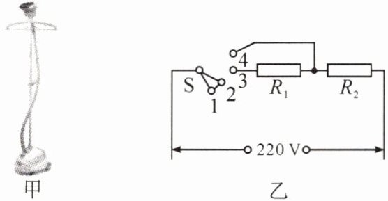 例2 (2024·齐齐哈尔)如图甲所示是一款利用高温水蒸气熨烫衣服的家用便携式挂烫机,它的正常工作电压为 $ 220\ V $。有高温、低温两个加热挡位,其内部简化电路图如图乙所示,当双触点开关 $ S $ 接触 $ 1 $ 和 $ 2 $ 时为关机状态。$ R_1 $、$ R_2 $ 是两个阻值不变的电热丝,$ R_1 = R_2 = 48.4\ \Omega $。问: