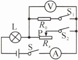 思路点拨 (1)知道小灯泡的额定电压、额定功率,利用$P = UI$计算小灯泡的额定电流;(2)利用欧姆定律计算小灯泡的电阻;(3)只闭合开关 S、$S_{1}$,小灯泡 L 与$R_{0}$串联,小灯泡恰好正常发光,电路中的电流等于小灯泡的额定电流,利用$U = IR$计算电源电压;(4)由图可知,只闭合 S、$S_{2}$时,小灯泡 L 与$R_{x}$串联,电流表测电路中的电流,电压表测$R_{x}$两端的电压;已知滑动变阻器$R_{x}$上标有“200 Ω 1.25 A”的字样,电流表 A 的量程为 0~3 A,小灯泡的额定电流为 0.6 A,结合串联电路的电流特点可知电路中的最大电流,可求此时电压表的最小示数,据此确定是否损坏电压表;利用欧姆定律计算变阻器$R_{x}$的最小阻值;向右滑动滑片时,其接入电路的电阻变大,电流变小,根据分压原理,变阻器两端电压(即电压表示数)变大,由于电压表使用的量程为 0~15 V,可得$U_{最大} = 15 V$,利用欧姆定律可得此时电路中的最小电流、变阻器$R_{x}$的最大阻值,进而得出滑动变阻器$R_{x}$能接入电路的阻值范围。