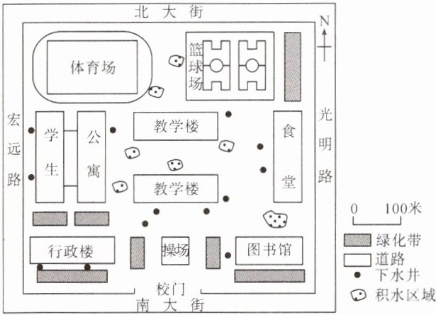 小组成员测量并绘制了校园平面图。某次较强降水后,同学们找到积水位置,并